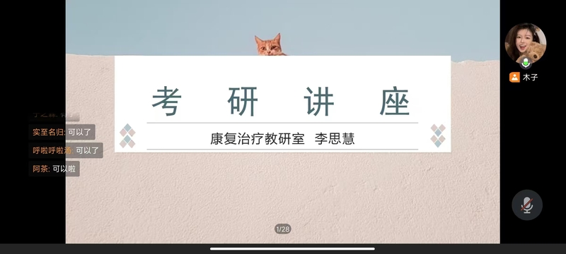 书院邀请到了康复医学院李思慧老师、罗阳老师、左佰睿等四位老师为2021级康复治疗学专业、康复工程、假肢矫形专业学生答疑解惑。李思慧老师详细分析了国内知名医学院校及其康复治疗学专业的特色,强调了根据个人兴趣与职业规划进行选择的重要性,并建议考生们要制定合理的学习计划,合理分配时间进行公共课和专业课的复习。左佰睿老师详细介绍了关于康复治疗学考研的相关知识与技巧。罗阳老师和邵振鹏老师主要探讨了一些关键的考研注意事项和应试技巧,并鼓励所有考生都能够充分利用现有资源做好充分准备,迎接即将到来的挑战!
