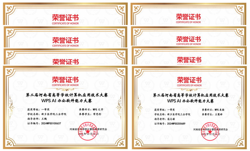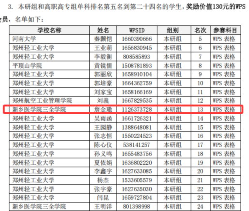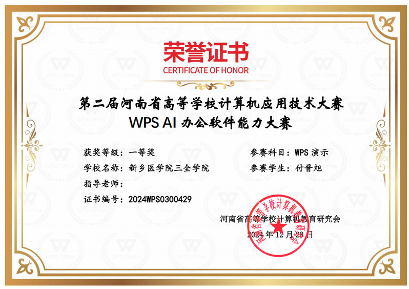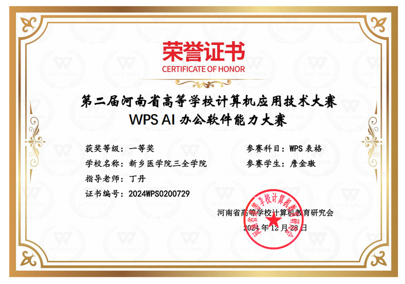 近日,2024年第二届河南省高等学校计算机应用技术大赛——WPS AI智能办公能力大赛结果公布,智行书院学子获奖级别和获奖人数再创新高,共239人获奖,其中一等奖33人、二等奖76人、三等奖130人。值得一提的是,詹金璈同学在WPS表格项目中荣获第13名,付晋旭同学在WPS演示项目中排名第17位,两位同学凭借优异表现同时获得了WPS会员专项奖励,充分展现了智行书院学子扎实的计算机应用能力和信息化素养。