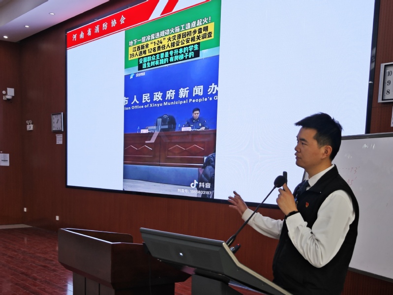 教学楼D2教室,河南省消防协会教员结合近年来高校火灾案例,深入浅出地讲解了火灾的危害性、校园常见火灾隐患以及火场逃生自救等消防安全知识。他指出,学生违规使用大功率电器、乱拉乱接电线、使用明火等是校园消防安全的主要隐患,提醒同学们要时刻保持警惕,杜绝侥幸心理。