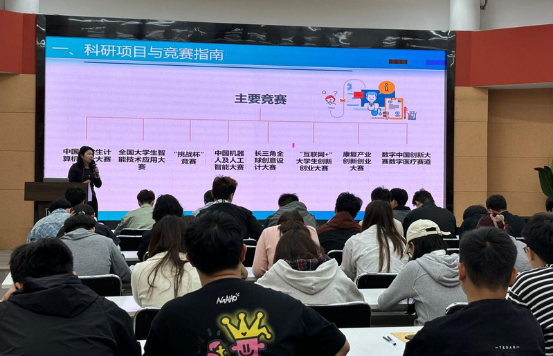 会上,尚老师通过可视化数据图表,给同学们详细介绍了全国大学生智能技术应用大赛、中国机器人及人工智能大赛等五大权威赛事,着重剖析创新训练、创业训练和创业实践三类项目的申报条件与评审标准,并结合流程图具体说明从项目孵化到成果转化的完整路径。在备赛选题实战环节,尚老师以Nature Biomedical Engineering等顶刊最新研究动态为引,分享了“三位一体”选题法:学科交叉处找切口、临床痛点中寻价值、技术瓶颈上求突破,给现场的同学们提供了新的思路和方向。活动最后,尚老师鼓励同学们,希望大家以问题为舵锚定方向,用实践丈量认知鸿沟,破除完美主义桎梏,在迭代中实现从“0”到“1”的突破。
