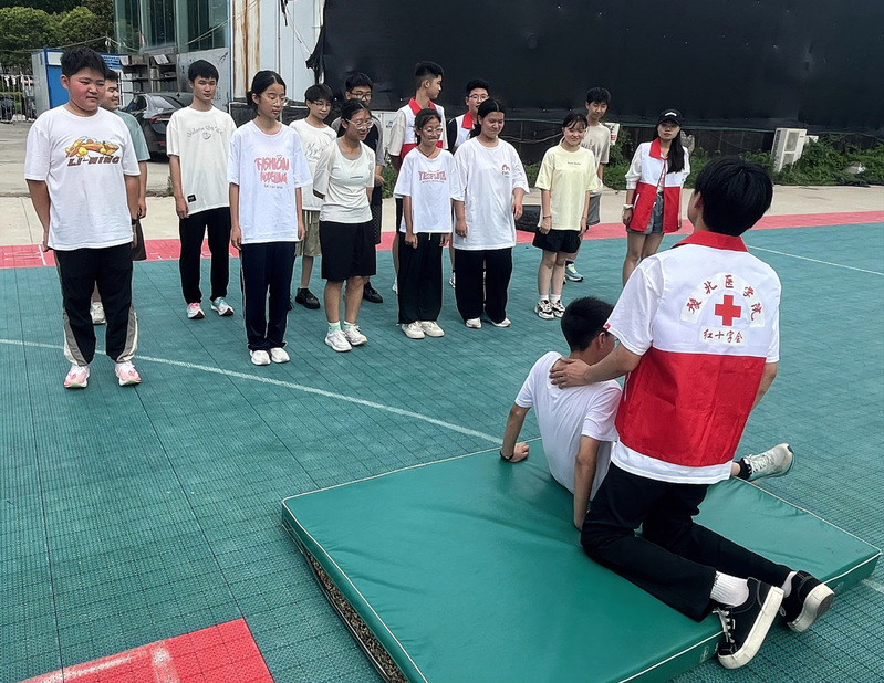 收官阶段,服务队在商丘爱力特训练中心开展沉浸式急救教学。队员们将急救步骤编成口诀、设计成情景模拟游戏,引导孩子们在角色扮演中练习包扎、呼救、心肺复苏等技能,通过“小手拉大手” 的传递模式,让 50 余名学生成为家庭中的 “急救小能手”,推动急救知识向家庭场景渗透。
