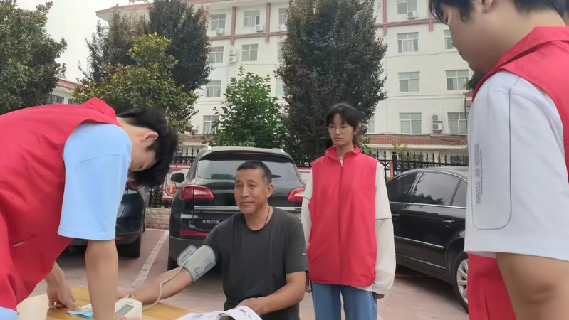 阳光社区活动中心门口的“健康服务点”里,队员分工协作:协助社区医生王大夫测血压,有人帮老人卷袖、固定袖带,有人记录数值;另有队员登记居民基本信息与既往病史,现场血压计、血糖仪及宣传折页整齐摆放,队伍有序推进。社区活动中心内,实践团协助王医生开展视力检查。队员们分工明确,或站在视力表旁用指示棒点视标,或引导居民用遮眼板并记录结果,还有人维持秩序。检查后,他们向居民递发视力卡片与护眼宣传单,并联合王医生整理归纳检查数据。
