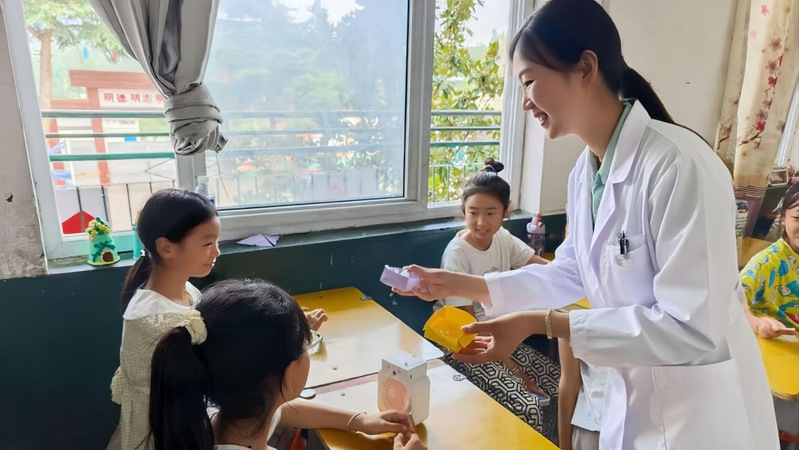 活动首战在村委会旁的空教室精心布置学习角落,推进儿童关爱活动 ,为25名留守儿童开展一对一作业辅导。在村委会旁布置的学习角里,队员谢雨瞳为四年级学生王宇辅导数学图形题时,面对理解难点不急躁,通过草稿纸画图演示的方式逐步引导,直至孩子完全掌握。6 岁妞妞手持 “医” 字卡片准确认读,并关联到 “昨日测血压的姐姐所教”,不仅体现出此前活动的知识延续性,更说明这种结合生活场景的教学方式,能让孩子快速吸收知识,实现了知识启蒙与兴趣培养的双重效果,现场活跃的互动氛围也让孩子们在快乐中收获成长。