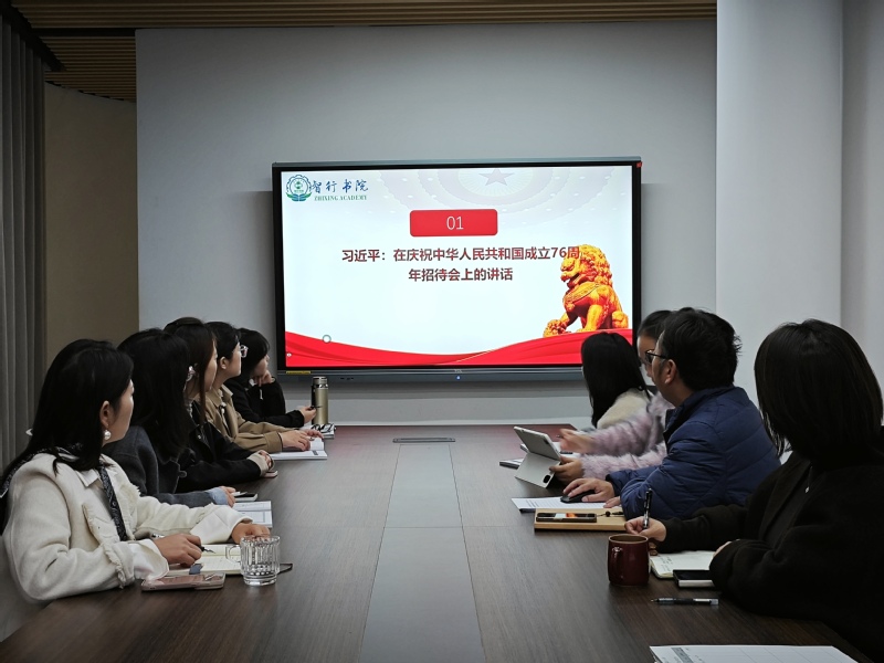 会议伊始,李印省带领大家集中学习习近平总书记在庆祝中华人民共和国成立76周年招待会上的讲话,重点解读新中国成立76年来的辉煌成就、当前工作重点及“十五五”规划相关展望;孙媛慧带领大家学习任仲平文章《中华民族伟大复兴势不可挡》,围绕“复兴势不可挡的五大支撑”展开系统梳理;娄冰琼带领大家学习中共国家统计局党组关于“十四五”时期我国经济社会发展取得新的重大成就的论述,结合经济实力、创新驱动、绿色转型等核心数据解读发展成果,李莹莹领学习近平总书记关于“中华民族共同体的形成和发展是人心所向、大势所趋、历史必然”的重要论述。与会人员结合书院工作实际,围绕国家发展成就与民族复兴、高等教育服务国家战略等主题展开初步研讨。