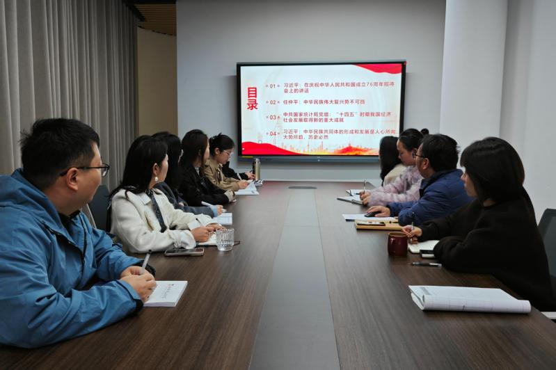 会议伊始,李印省带领大家集中学习习近平总书记在庆祝中华人民共和国成立76周年招待会上的讲话,重点解读新中国成立76年来的辉煌成就、当前工作重点及“十五五”规划相关展望;孙媛慧带领大家学习任仲平文章《中华民族伟大复兴势不可挡》,围绕“复兴势不可挡的五大支撑”展开系统梳理;娄冰琼带领大家学习中共国家统计局党组关于“十四五”时期我国经济社会发展取得新的重大成就的论述,结合经济实力、创新驱动、绿色转型等核心数据解读发展成果,李莹莹领学习近平总书记关于“中华民族共同体的形成和发展是人心所向、大势所趋、历史必然”的重要论述。与会人员结合书院工作实际,围绕国家发展成就与民族复兴、高等教育服务国家战略等主题展开初步研讨。