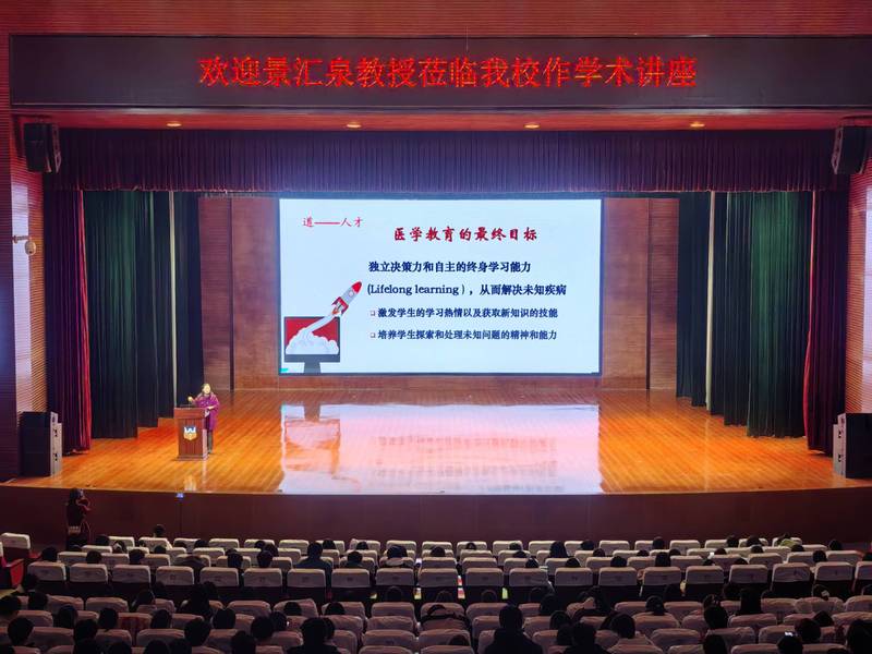 本次讲座紧扣“新医科”建设号召,旨在搭建前沿医学理念与科创实践的桥梁,激发学生科研创新的热情,夯实新医科人才培养基础。深耕健康管理领域多年的景汇泉教授,以“早期医疗实践明确学习目标”为核心展开分享。她以“为何学医学”引发学子思考,强调医学是终身探索、持续创新的事业,新医科教育需打破知识壁垒,通过临床实践、项目研究等载体让理论“活”起来,培养学生独立决策能力与终身学习能力。同时景教授结合自身指导“老年慢性病管理”科创项目的经验指出,医学生科创能力的培养可通过“视野拓展、专业实践、创新教育、PBL 研讨学习”四大模块逐步推进,最终让学生的科创项目从“观摩学习”走向“自主创造”。