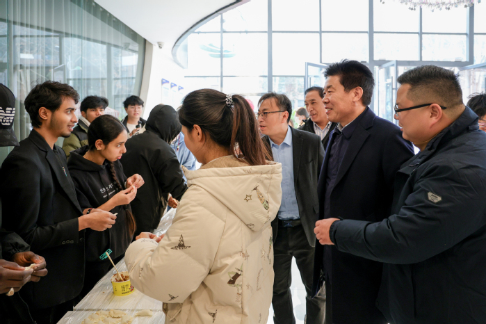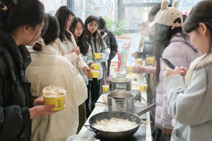 活动现场暖意融融,案板、馅料、擀面杖等工具整齐排布,面粉清香与食材鲜香交织。智行书院学子与国际学生分组协作,和面、擀皮、包馅等动作从生疏到娴熟,方形、月牙形、元宝形等创意饺子纷纷成型。李庚深入学子中间,亲手示范擀皮、捏褶技巧,结合“冬至吃饺子不冻耳朵”的民俗传说,细致解读冬至节气的文化内涵与历史渊源。“中国饺子的味道,就是团圆的味道。”他的话语引发学子共鸣。国际学生们在实操中感受中华民俗魅力,品尝亲手制作的饺子后,用真挚的中文称赞“好吃!中国饺子,真暖!”小小的饺子成为跨越国界的文化纽带,让中外友谊在欢声笑语中升温。